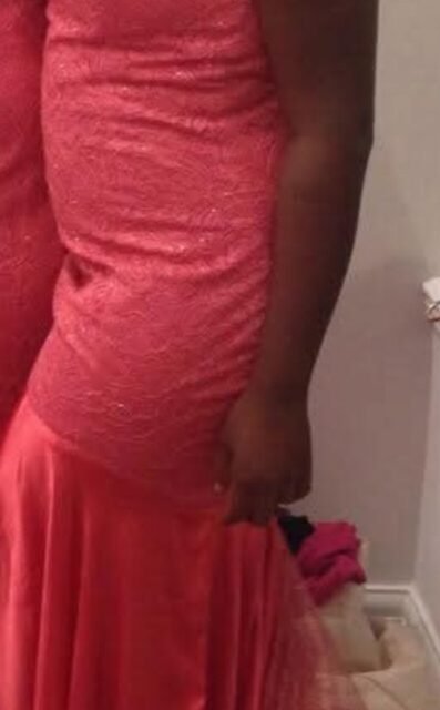 Pink lace dress with chiffon lower part in a fitted mermaid style. The dress was worn only once for a wedding and was tailored. In excellent condition.