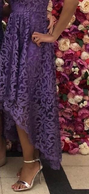 Off the shoulder purple lace dress, lined in purple satin fabric. Waterfall style skirt and fitted bodice. Zip at the back of the dress.